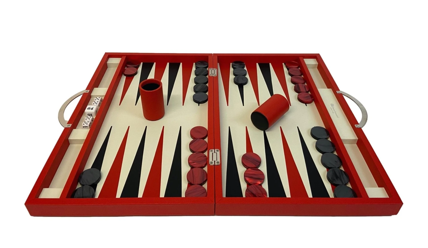 Spécialement fabriqués pour Rouge et Noir, ces backgammons exclusifs, dessinés par nos soins, sont spécialement fins, à fermeture magnétique et avec des poignées en métal légères et modernes, pour un design allégé, sobre et intemporel.