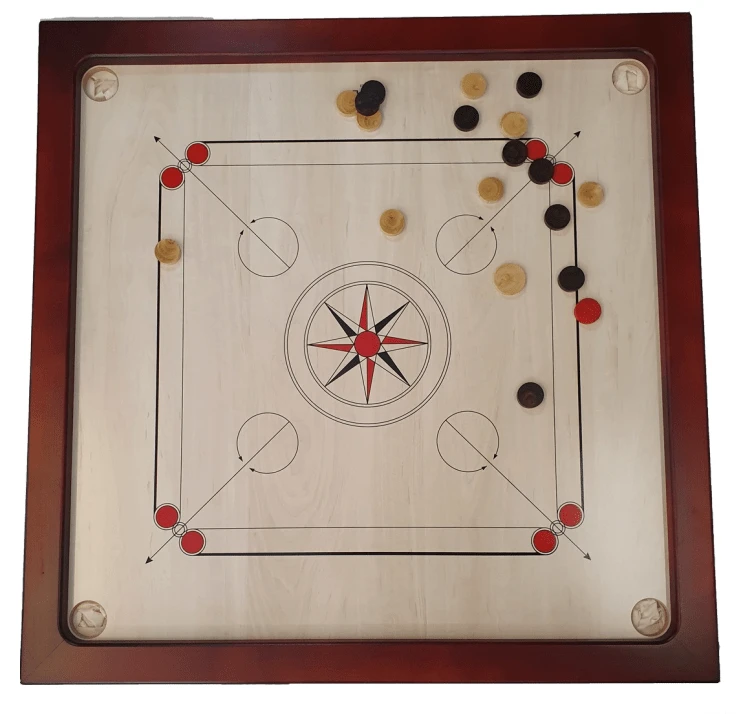 Carrom classique fabriqué dans le Jura, avec bords en hêtre teinté acajou.