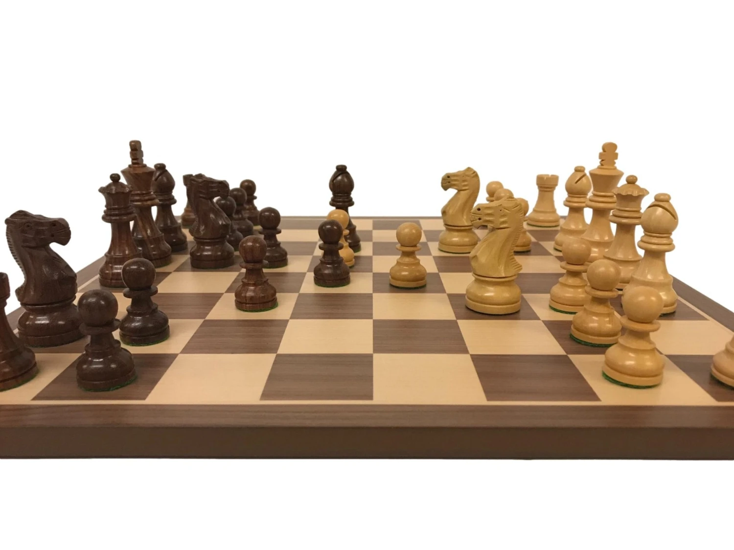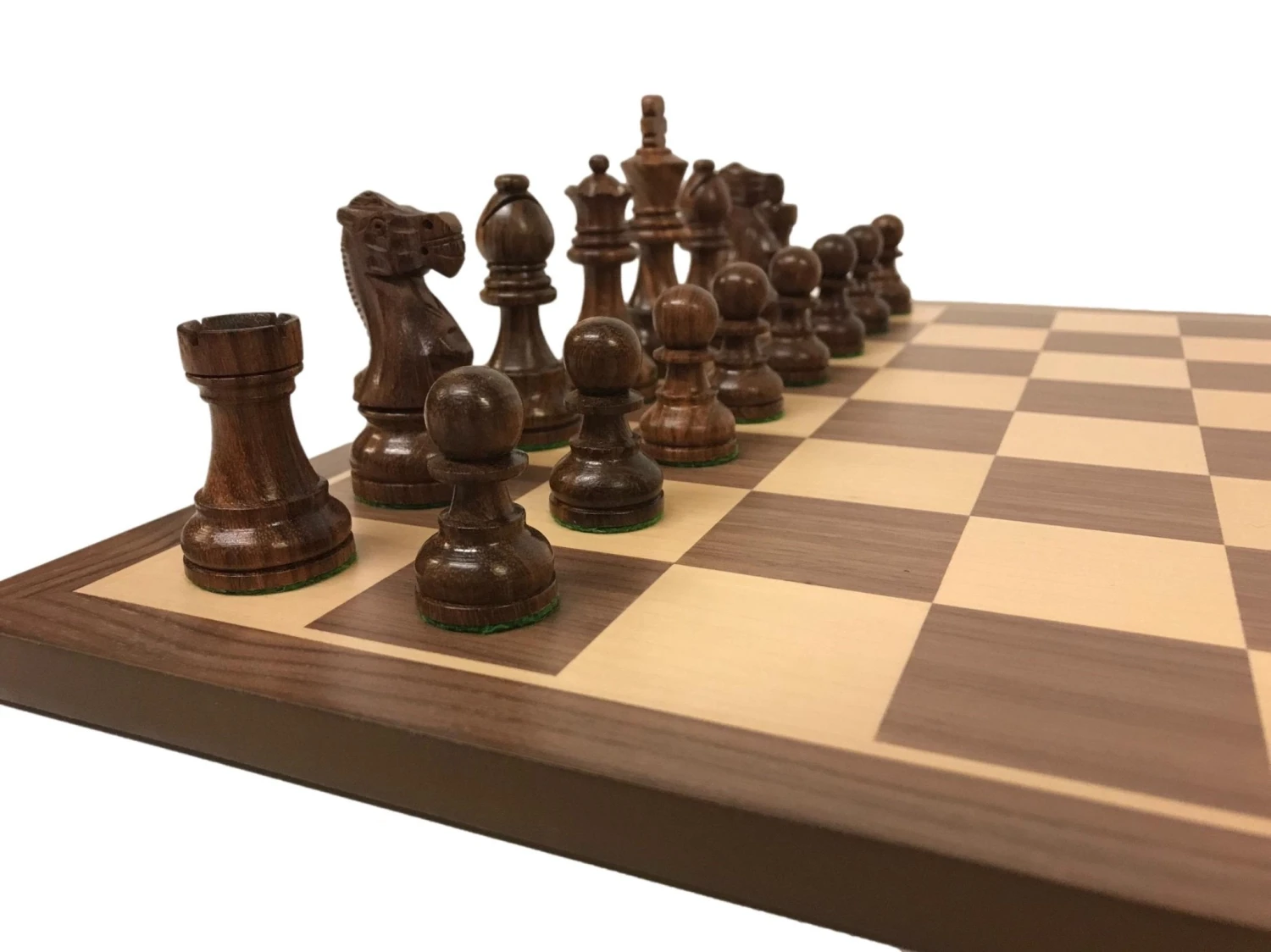 Ensemble d’échecs ultra classique composé d’un échiquier en marqueterie de Noyer et de sycomore à bords fins (ou Acajou / sycomore) et de pièces lourdes, de tournoi en Buis et Sheesham, triple plombées et feutrées.
