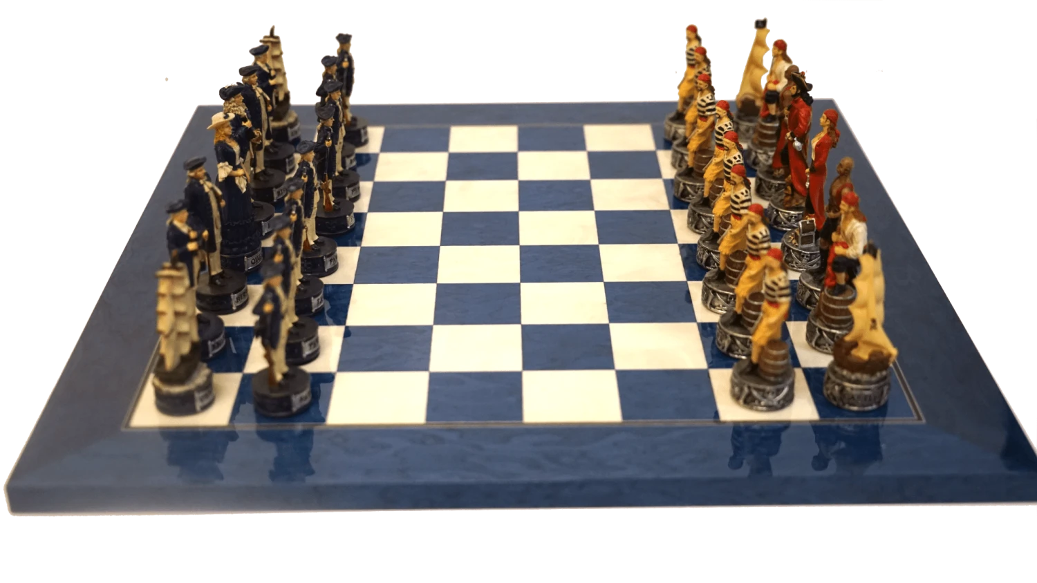 Magnifique ensemble comprenant un plateau en bois teinté et laqué, ainsi que des pièces en résine, peintes à la main faisant s’affronter les pirates et la marine !