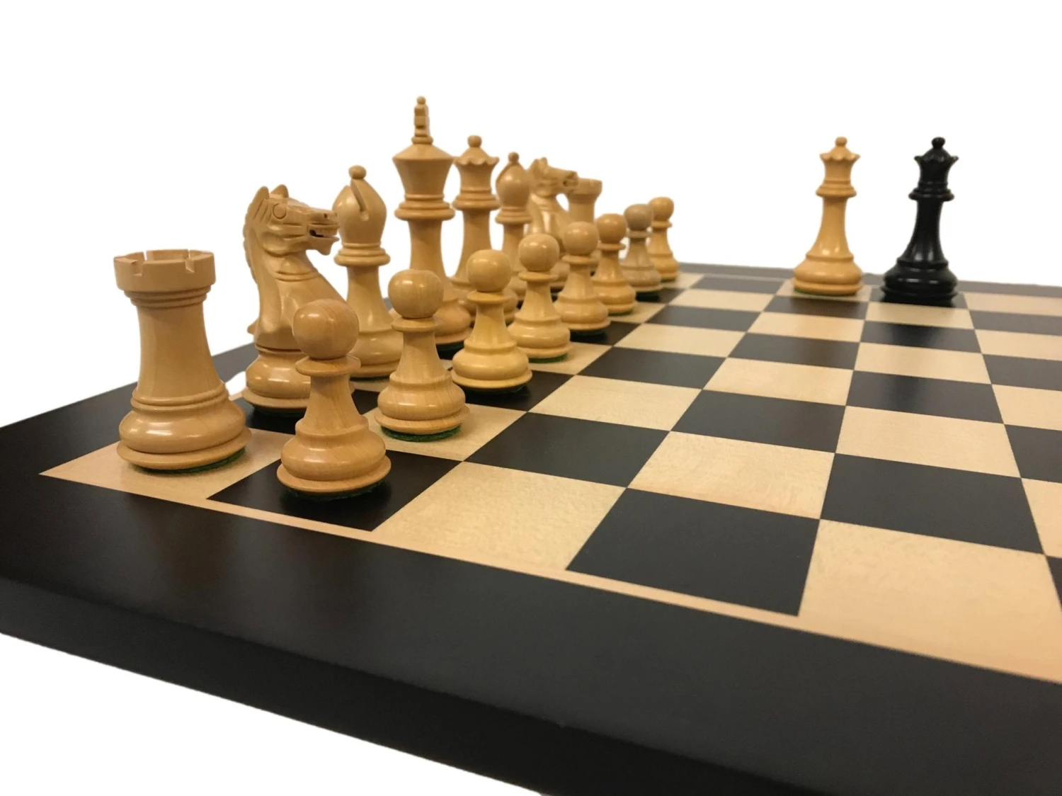 Les pièces, tournées à la main, aux finitions très minutieuses (bases biseautées, crinières détaillées, croix des rois magistrales) sont plombées et feutrés pour un confort de jeu optimal.