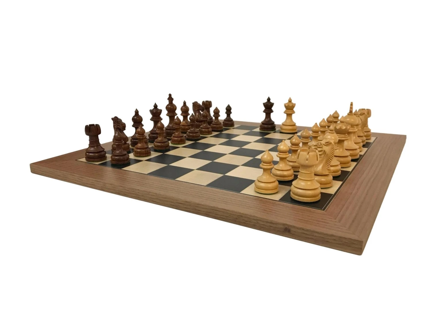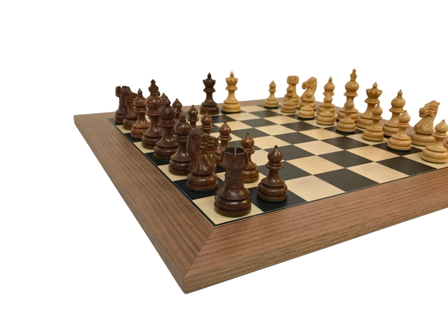 Le bord en noyer rappelle la douceur des pièces, et les cases en sycomore et poirier teinté noir, au contraire, contrastent et offrent ainsi une impeccable vision du jeu.