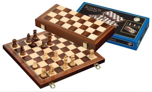 Jeu d’échecs pliant en marqueterie d’acajou et érable, pièces aimantés et plateau magnétique.