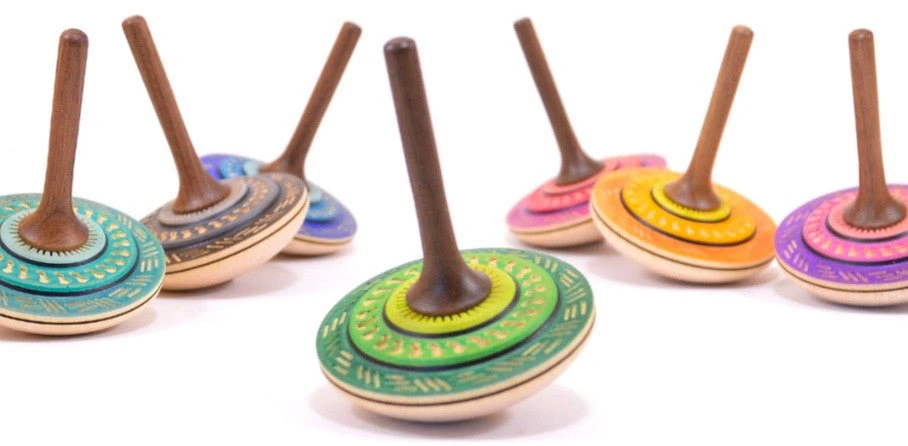 Toupie en bois d’érable et de noyer, tournée à la main avec motifs décoratifs, dessinés sur un camaïeu de couleur.